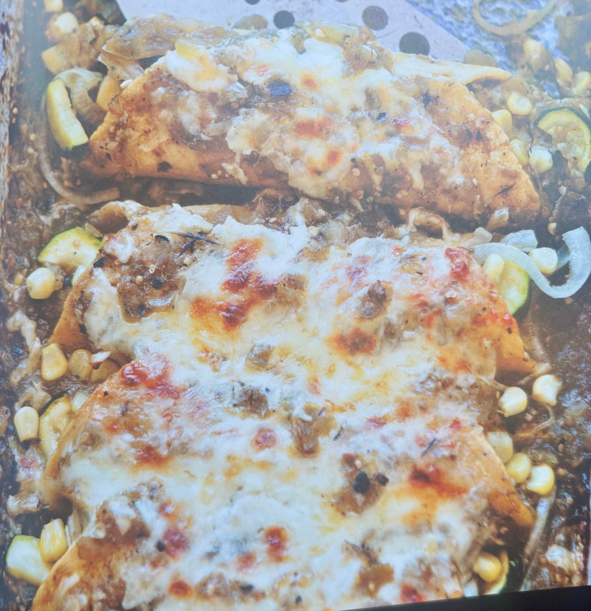 Ingrédients: tortillas de maïs, courgettes, salsa de tomatillos, maïs, oignons, oignons jaunes, monterey jack, cheddar, huile végétale, sel et poivre.
