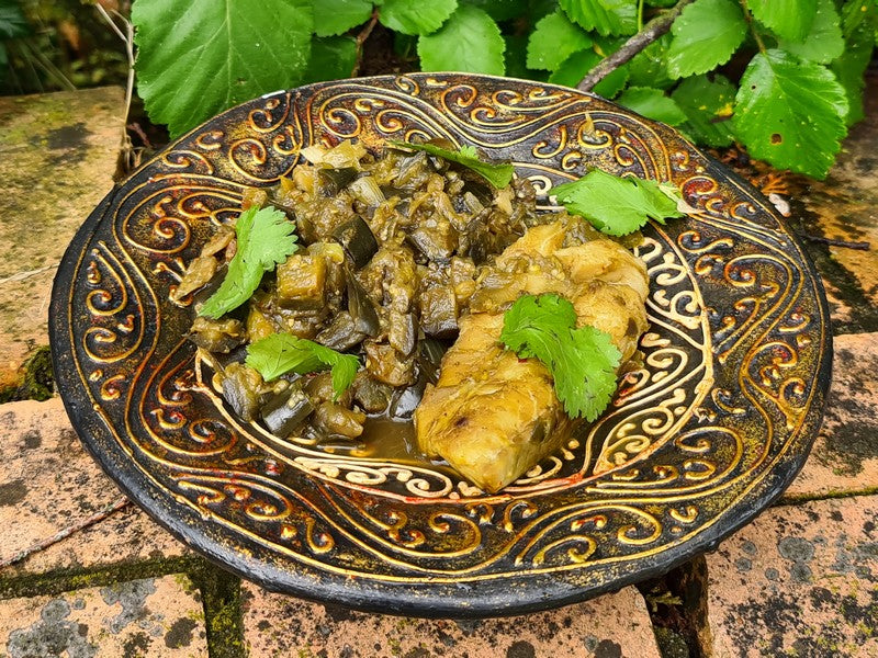 Ingrédients: morue, aubergines, riz, oignon, huile de coco, ail, curcuma, poudre de gingembre, poudre de piment, coriandre, sel et poivre.