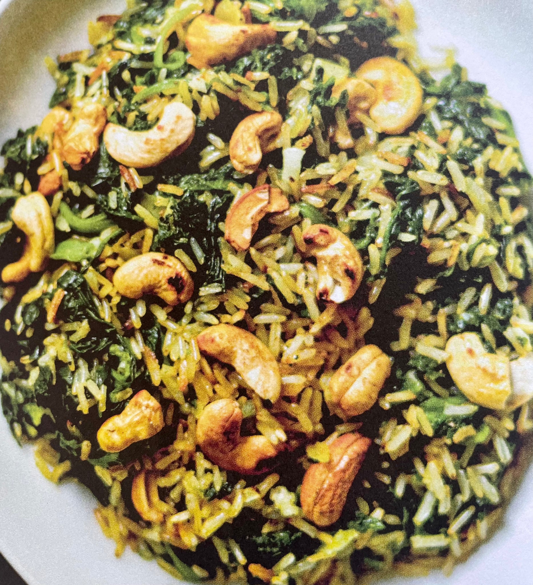 Ingrédients: riz, vermicelles, épinards, noix de cajou, oignons verts, persil, gingembre, curry, sucre, ail, gingembre, huile de sésame, poivre.