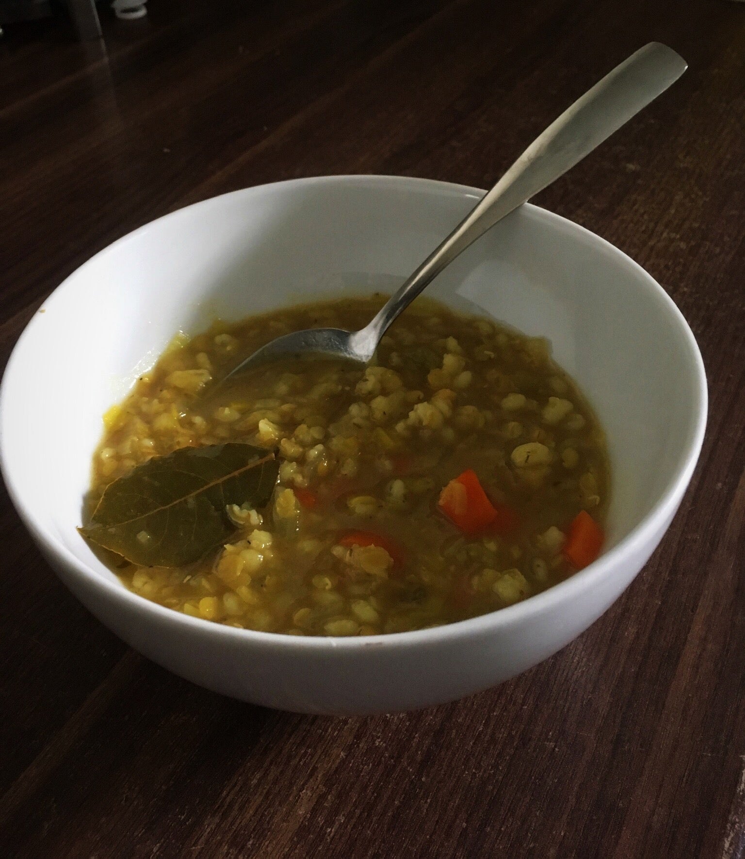 Ingrédients: bouillon de poulet, orge perlé, lentilles, poireau, carotte, céléri, oignon, huile d’olive, curry, ail, thym, feuille de laurier, sel et poivre.