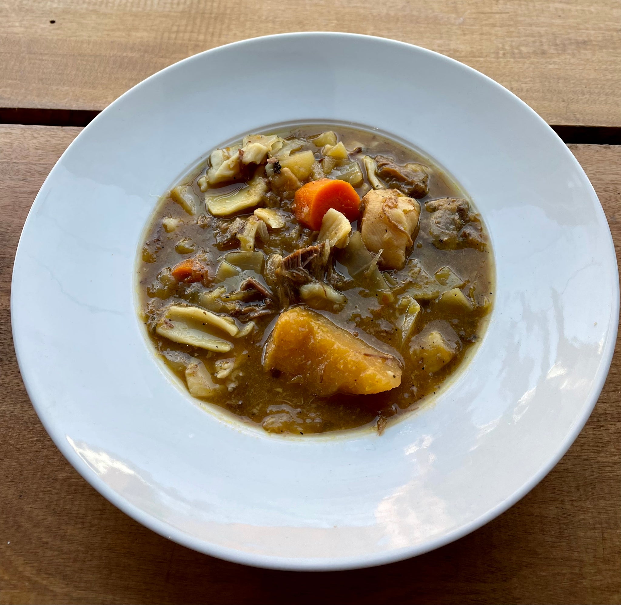Ingrédients: bouillon de boeuf,  boeuf, Giraumon, pâtes ( rigatoni),poireaux, pommes de terre, malanga, manioc, carottes, rutabaga, céleri, épices haïtienne, bouquet garni (persil et thym), oseille, échalote, ail, clous de girofle, sel et poivre,