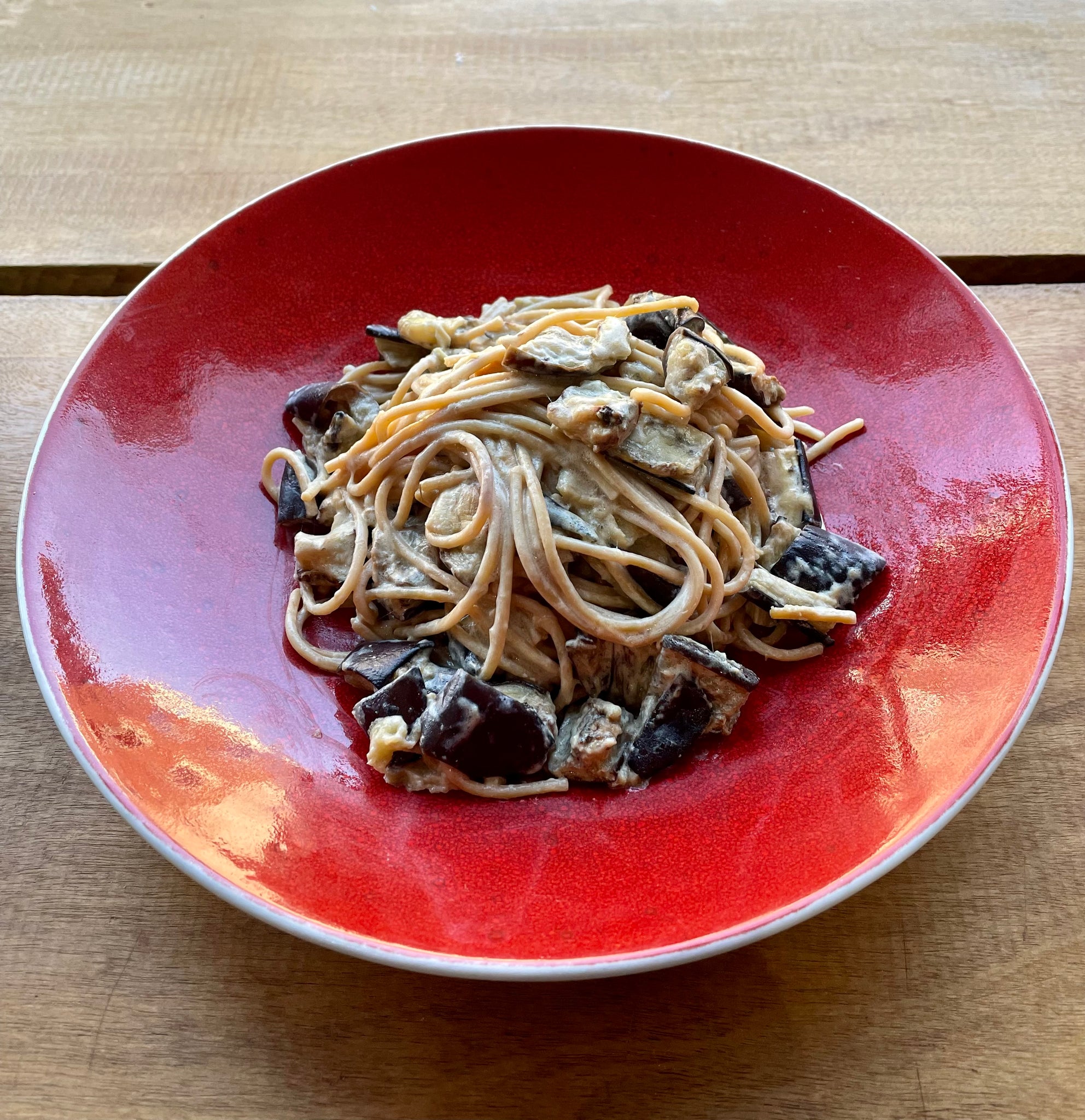 Ingrédients: aubergines, spaghettis complets, beurre, miso, parmesan, huile d'olive, sel et poivre.