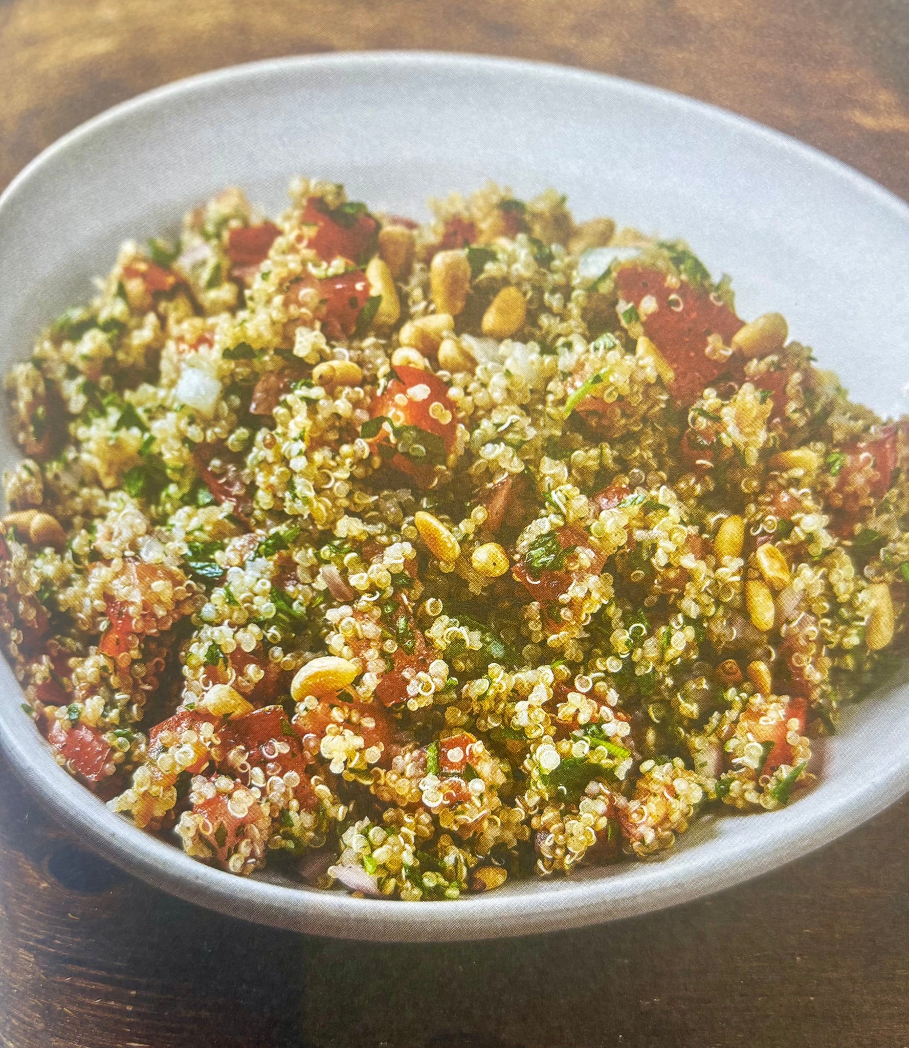 Ingrédients: quinoa, tomates cerise, persil, menthe, noix de pin, échalote,  piment de lka Jamaïque, huile d'olives, sel et poivre.