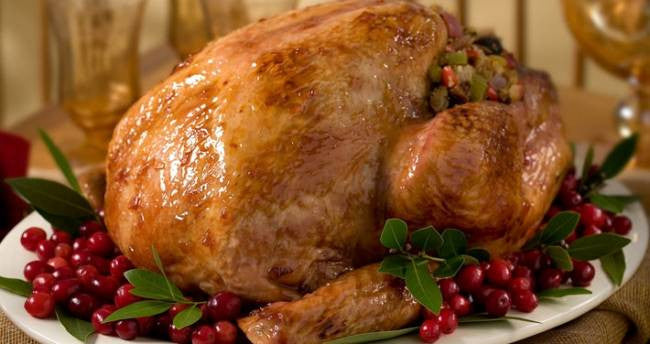 Ingrédients: dinde, bouillon de poulet, pommes de terre, bacon, cheddar, lait, beurre, canneberges, pain, sucre brun, oignon, céleri, carotte, ail, piment de la Jamaïque, cannelle, fines herbes, huile d'olive, beurre, sel et poivre.